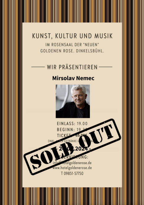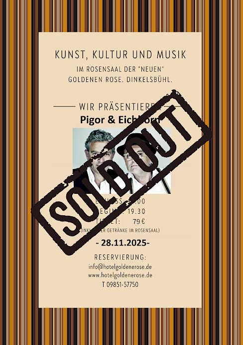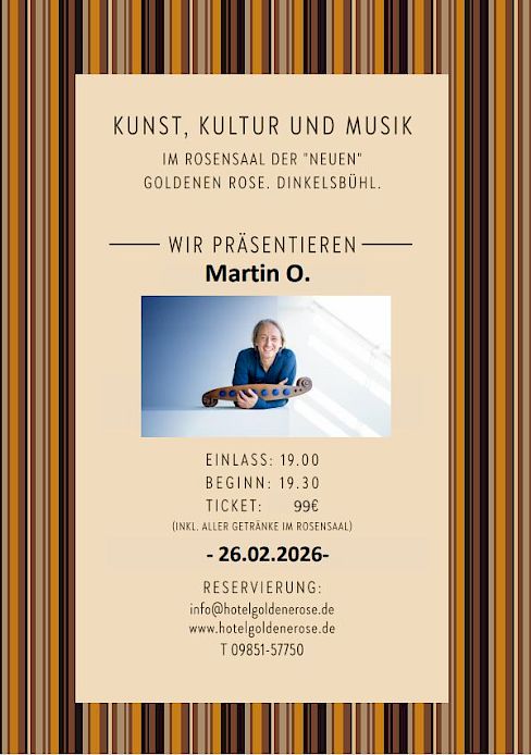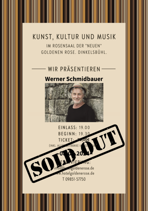 Der Rosensaal bietet allen Gästen und Besuchern die einzigartige Möglichkeit namhafte Künstler, Artisten, Redner, Autoren und Musiker „hautnah“ zu erleben. Genießen Sie mit max. 90 weiteren Personen exklusive Künstler und Performances mitten in Dinkelsbühl. Eingeweiht wurde der Rosensaal im November 2022 mit einem Konzert von PE WERNER. Genießen Sie exklusive Aufführungen in intimer Atmosphäre. Karten & Info.