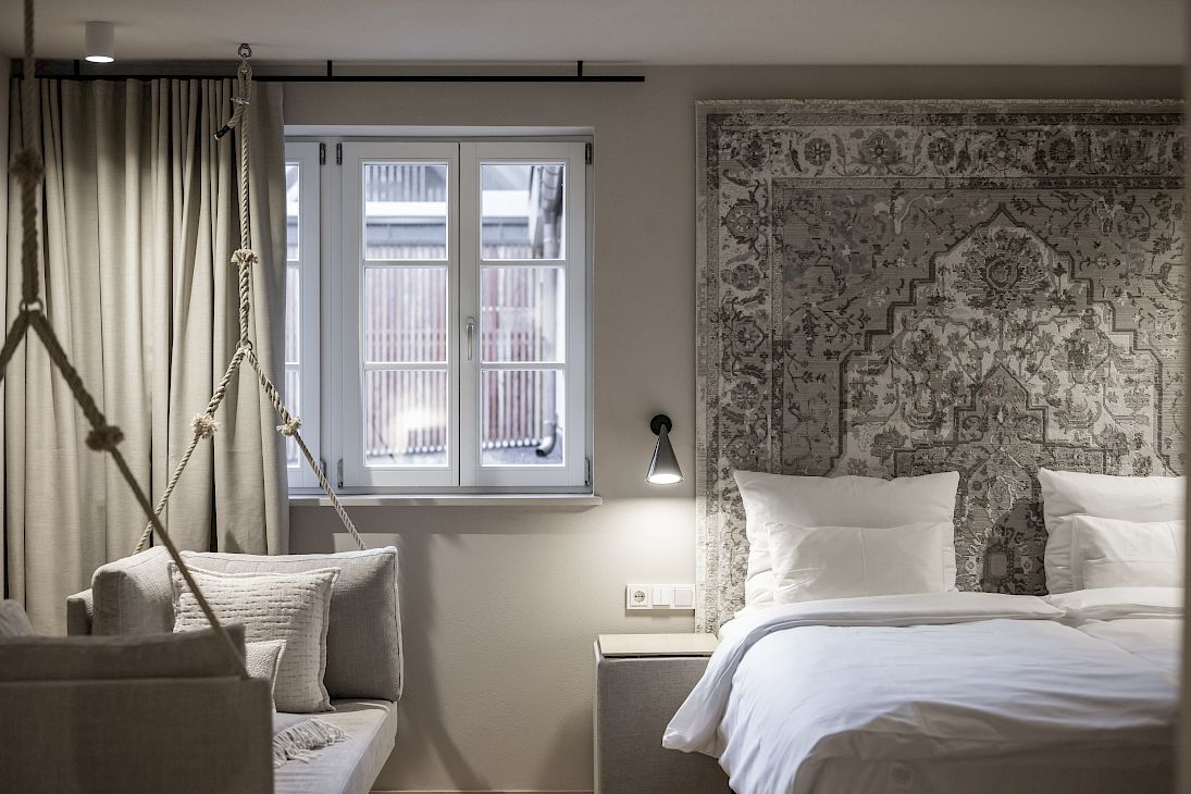 Create your own personal feel-good living space in our junior suites. Bright rooms, state-of-the-art equipment and luxurious room layouts await you. In addition to a king-size bed, there is a lounge area Partly with a hanging swing and other seating options -ideal for a perfect weekend with your loved ones. Let us pamper you and enjoy the advantages of a junior suite. You can relax in your luxurious bathroom with a rainforest shower and separate toilet.